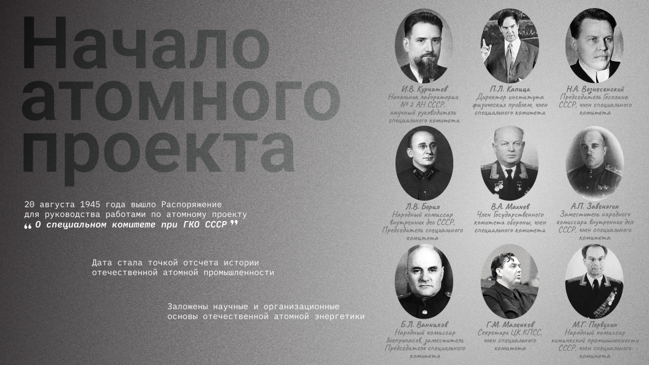 20 августа 1945 года было создано Первое главное управление при Совете народных комиссаров СССР для руководства работами по атомному проекту. Именно эта дата стала точкой отсчета истории отечественной атомной промышленности, которая уже 80 лет “держит” ядерный щит страны, обеспечивает энергией города, развивает науку и новые технологии уже далеко не только по “ядерным” направлениям.